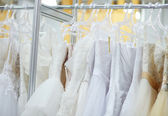 Kilka eleganckich ślub, druhna, wieczór, suknia balowa lub prom sukienki na wieszaku w sklepie ślubnym.