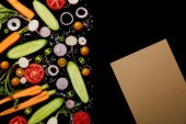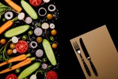 Widok z góry na świeże plasterki warzyw z solą w pobliżu noża i widelca izolowane na czarno z kopią przestrzeni
