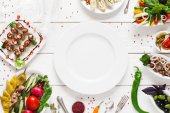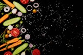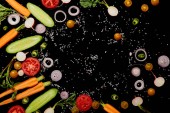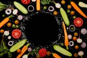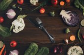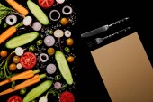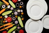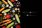 Widok z góry na okrągłe płyty i sztućce w pobliżu warzyw w plasterkach na czarno