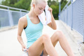 atrakcyjny zmęczony młody Kobieta w Odzież sportowa przytrzymanie skakanka