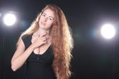 Portret młodej, atletycznej i seksownej kobiety w czarnej bieliźnie na czarnym tle