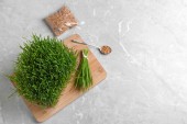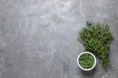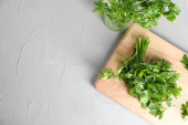 Płaska kompozycja z świeżej zielonej pietruszki na szarym stole, miejsce na tekst