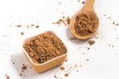 Brązowy cukier na białym tle w szklanej misce, ponad stylu marmuru tle. Liście mięty. Widok z góry, Kopiuj spację.