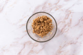 Brązowy cukier w metalowych łyżek na jasnym, marmurowym tle z kopią przestrzeni. Składnik deserowy, cukier uzależnionych.