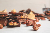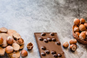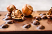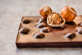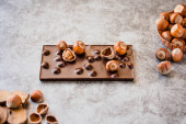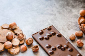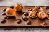 Domowy czekolada z orzechowym paskiem. Orzechy i tło czekoladowe.