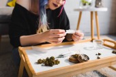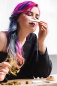 piękna dziewczyna Hipster z kolorowymi włosami wąchania stawu z chwastem