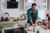 Pozytywny człowiek uśmiechnięty podczas wygładzania krem na ciasto