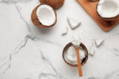 Widok z góry gliny proszku i soli morskiej w misach na marmurowym stole w pobliżu drewnianych łyżek