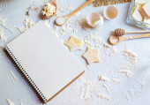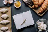 Widok z góry ekologicznych kosmetyków i białego papieru z ołówkiem na marmurowym stole