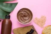 wykadrowany widok kobiety mieszania gliny w misce na marmurowym kole w pobliżu organicznych składników kosmetycznych na beżowym tle z rozrzuconych płatków kwiatów