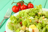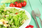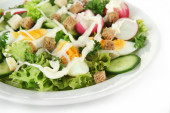 Zdjęcie "Sałatka Cezar na białe płytki, z bliska" może być wykorzystywane do celów osobistych i komercyjnych zgodnie z warunkami zakupionej licencji Royalty-free. Obraz jest dostępny do pobrania w jakości wysokiej rozdzielczości do 5760x3840.