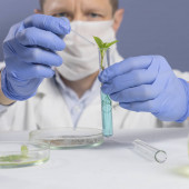 Koncepcja ziołowych medycyny alternatywnej, człowiek trzyma probówki z liści, zbliżenie