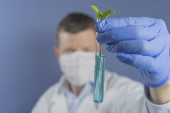 Analizując Naukowiec badanie próbki roślin w probówce Workin w laboratorium genetyki, mężczyzna Naukowiec badanie wynik eksperymentu