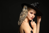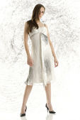 Portret pięknej damy ze złotą farbą na skórze na szarym tle