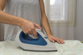 Kobieta prasująca koszulę w pomieszczeniu, zbliżenie. Miejsce na tekst