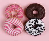 Smaczne pączki na różowym tle. Narodowy Dzień pączki.
