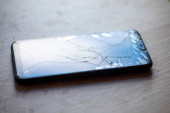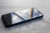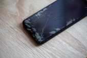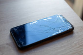 Smartfon ze złamanym ekranem dotykowym na czarnym pulpicie