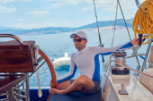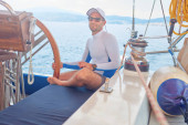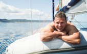 Portret młodzieńca relaks na żaglówce o zachodzie słońca.