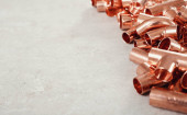 Zbliżenie różnych zaworów kulowych i metalowych adapterów do rur.