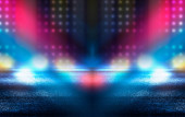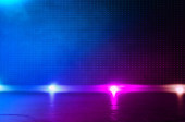 Tło pustej sceny ciemnej, Pokój z lampami neonowych. Betonowa podłoga, neon niebieski i różowe światło, dym