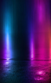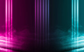 Zdjęcie "Pusta scena w tle. Ciemna ulica, odbicie niebieskiego i różowego światła Neonowego na mokrej nawierzchni. Promienie światła w ciemności, dym. Nocny widok na ulicę, miasto. Streszczenie ciemne tło." może być wykorzystywane do celów osobistych i komercyjnych zgodnie z warunkami zakupionej licencji Royalty-free. Obraz jest dostępny do pobrania w jakości wysokiej rozdzielczości do 5760x3840.
