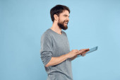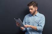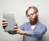 Poważny młody Brodaty człowiek za pomocą cyfrowego tabletu przeciwko pomarańczowym tle