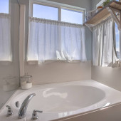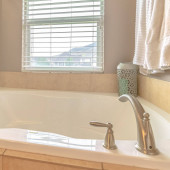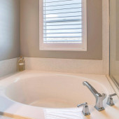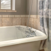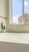 Rama kwadratowa wanna i oddzielna kabina prysznicowa wewnątrz łazienki z wieszakiem na ścianie