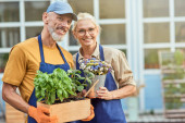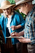 selektywne skupienie szczęśliwej seniora i mężczyzny w słomkowych kapeluszach stojących w pobliżu zielonych roślin