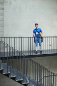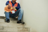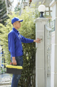 Zdjęcie "Zbliżenie człowieka pracujących w dziale serwisowania stojąc z przybornika i schowka z dokumentem w pobliżu bramy domu" może być wykorzystywane do celów osobistych i komercyjnych zgodnie z warunkami zakupionej licencji Royalty-free. Obraz jest dostępny do pobrania w jakości wysokiej rozdzielczości do 5760x3840.