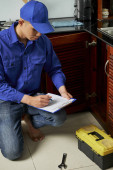 Zbliżenie człowieka pracujących w dziale serwisowania stojąc z przybornika i schowka z dokumentem w pobliżu bramy domu