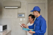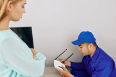 Młody mechanik stojący w mundurze ze skrzynką na narzędzia i dzwoniący dzwonkiem przy bramie domu