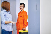 Zdjęcie "Młody mechanik stojący w mundurze ze skrzynką na narzędzia i dzwoniący dzwonkiem przy bramie domu" może być wykorzystywane do celów osobistych i komercyjnych zgodnie z warunkami zakupionej licencji Royalty-free. Obraz jest dostępny do pobrania w jakości wysokiej rozdzielczości do 5760x3840.