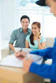 Zdjęcie "Uśmiechnięta kobieta otwarcie drzwi domu i pozdrowienia repairman w mundurze z przybornika" może być wykorzystywane do celów osobistych i komercyjnych zgodnie z warunkami zakupionej licencji Royalty-free. Obraz jest dostępny do pobrania w jakości wysokiej rozdzielczości do 5760x3840.