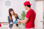 Uśmiechnięta kobieta otwarcie drzwi domu i pozdrowienia repairman w mundurze z przybornika