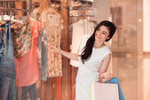 Szczęśliwy podekscytowany młody Asian kobieta podnoszenie ręce z torby na zakupy
