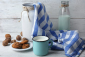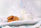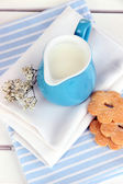 niebieski Dzbanek mleka i ciasteczka na piknik drewniany stół szczegół