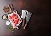 Zdjęcie "Surowe Chude poklejone zapiekanka stek wieprzowy wołowiny na deski do krojenia z rocznika mięsa topory na brązowe tło. Sól i papryka z rozmarynem i czerwoną cebulą i czosnkiem. Miejsce na tekst" może być wykorzystywane do celów osobistych i komercyjnych zgodnie z warunkami zakupionej licencji Royalty-free. Obraz jest dostępny do pobrania w jakości wysokiej rozdzielczości do 5760x3840.