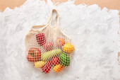 Kobieta z siatkową torbą pełną świeżych warzyw zakupy w sklepie, koncepcja zero odpadów