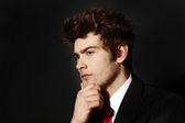 zamyślony biznesmen patrząc daleko trzymając rękę w pobliżu głowy izolowane na czarnym, ludzkiej emocji i koncepcji ekspresji