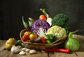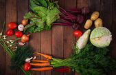 zestaw świeżych warzyw w ciemności. dania wegetariańskie na drewnianym tle. zbiory warzyw z ogrodu.