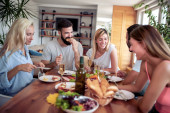 Zdjęcie "Grupa szczęśliwych młodych ludzi śmiać się i rozmawiać przy stole, impreza dla przyjaciół w domu." może być wykorzystywane do celów osobistych i komercyjnych zgodnie z warunkami zakupionej licencji Royalty-free. Obraz jest dostępny do pobrania w jakości wysokiej rozdzielczości do 5760x3840.