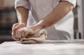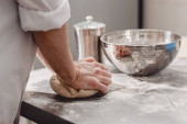 Baker dodaje mąkę do ciasta w żelaznej misce na stole w piekarni