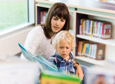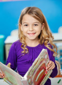 Dziewczyna czytająca książkę siedząc na biurku w przedszkolu