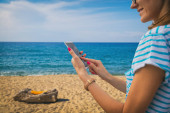 Dziewczyna za pomocą telefonu komórkowego, leżąc na tarasie przy basenie