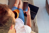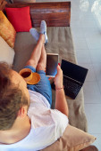 Zdjęcie "Człowiek za pomocą telefonu komórkowego i laptopa podczas picia kawy/herbaty na th" może być wykorzystywane do celów osobistych i komercyjnych zgodnie z warunkami zakupionej licencji Royalty-free. Obraz jest dostępny do pobrania w jakości wysokiej rozdzielczości do 5760x3840.