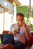 Człowiek za pomocą telefonu komórkowego i laptopa podczas picia kawy/herbaty na th