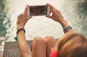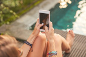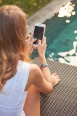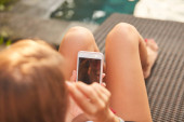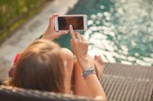Dziewczyna za pomocą telefonu komórkowego, leżąc na tarasie przy basenie
