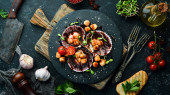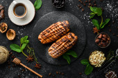 Deser tiramisu. Składniki do przygotowania tiramisu. Widok z góry. Na czarnym tle kamienia. Wolne miejsce na tekst.