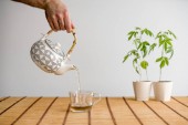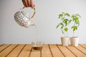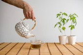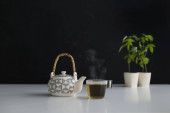 Stół bambusowy z roślin marihuany w ceramiki. Gorąca herbata CBD i czajniczek.