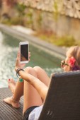 Dziewczyna za pomocą telefonu komórkowego, leżąc na tarasie przy basenie